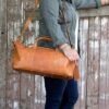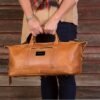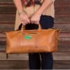 A legal carry-on size duffel bag made with a full leather bottom & 5 brass feet to protect against dirt. It has one large main compartment with a two way zipper & two small zippered pockets for your personal items. The bag has 420D/PVC backed lining to protect against spills. The shoulder strap adjusts from 32″ to 50″ for the perfect carrying length. It has a body hugging design & a nonslip padded shoulder pad. Or detach the strap & carry it with the two hook and loop closed handles. 17″ W x 10″ H