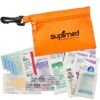 3 1/2″ x 5″ pouch constructed of 210D polyester ripstop material with clip. Includes 4 latex-free bandages, 2 snip bandages, 1 hydrocolloid blister bandage, 2 antiseptic towelettes, 1 first aid cream packet, 1 lip balm packet, 1 hand sanitizer packet, 1 sunscreen packet, 1 200 mg ibuprofen packet and a 2″ x 3″ adhesive pad. 3 1/2″ H x 5″ W x 1/4″ D