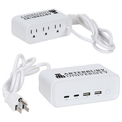 Upgrade your charging hub with our ABS fireproof AC outlet, 3 standard outlets, and 2 USB + 2 USB-C ports for 7-device simultaneous charging. A QR code is printed on each item providing access to the latest user manual. Flexible 5-ft cord, fast charging, and robust safety features. FCC and ETL certified for quality and safety. Elevate your charging experience! Complies with OU, Prop 65. 4.75″ L x 2.5″ W x 1.875″ H